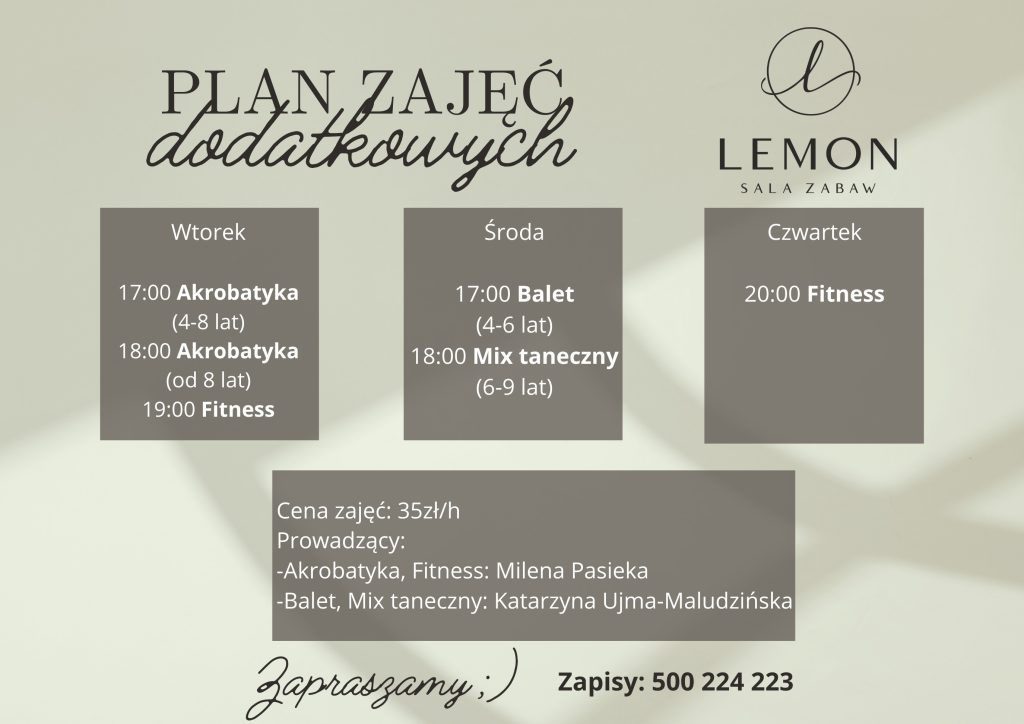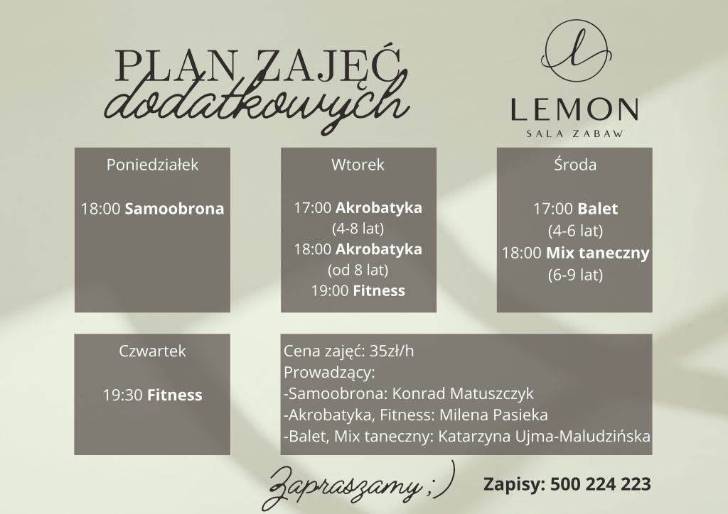 Lemon to nie tylko sala zabaw i kawiarnia. Zapraszamy do udziału w zajęciach pozalekcyjnych. Nasze sale wyposażone są w najwyższej jakości sprzęt – tablice i ekrany multimedialne, nagłośnienie, mikrofony bezprzewodowe, lustra do zajęć tanecznych i ruchowych, stoliki do zajęć.